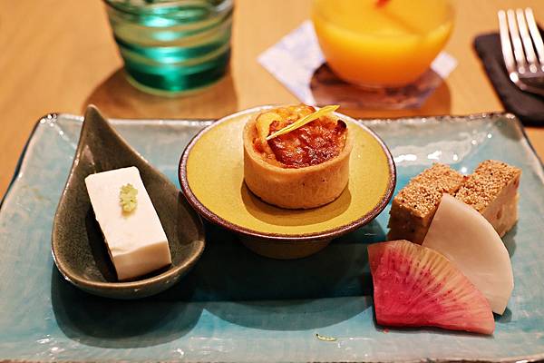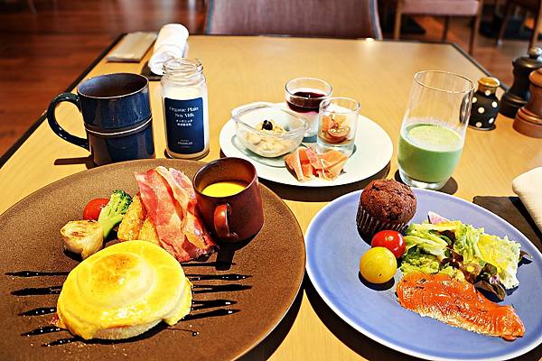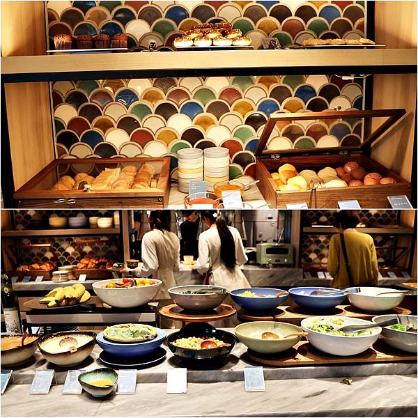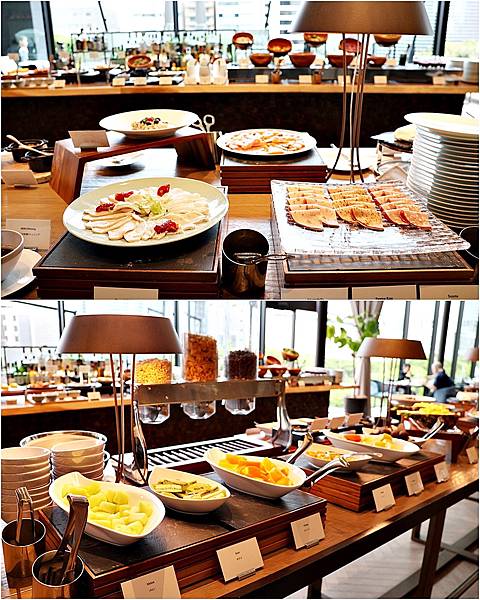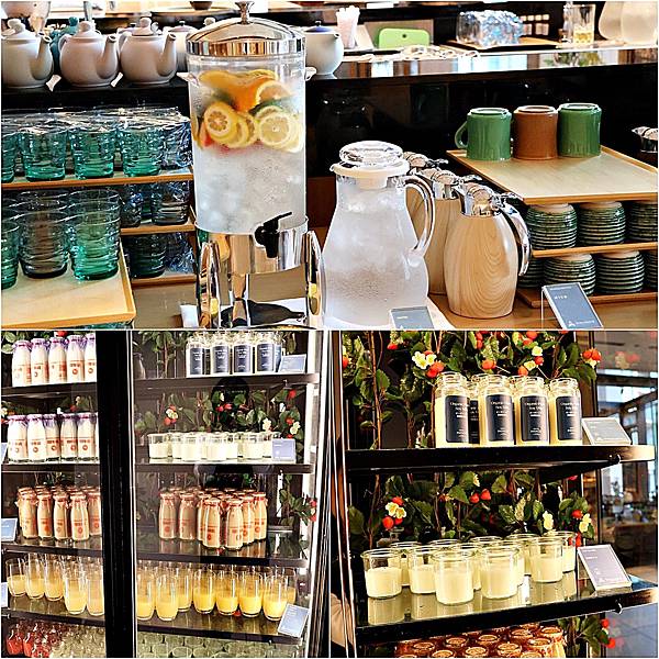 飯店的早餐提供自助式吃到飽菜色,無論沙拉、各式小菜、麵包、飲品都很豐盛。冰箱櫃裡有瓶罐裝牛奶、咖啡牛奶、豆漿、優格、果昔、果汁、布丁等等,連冰水裡都放了好多好多的水果,奢華感爆棚!