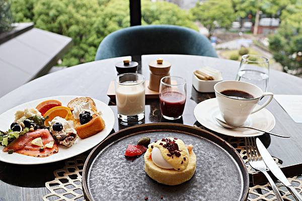 除了有自助餐吃到飽的精緻餐飲外,還可以單點主菜,我點的是在烤得酥酥脆脆的圓形吐司上放了一顆會爆漿的半熟班尼迪克蛋、這頓早餐也太精美了吧,聽說有很多人專程為它而來喔!