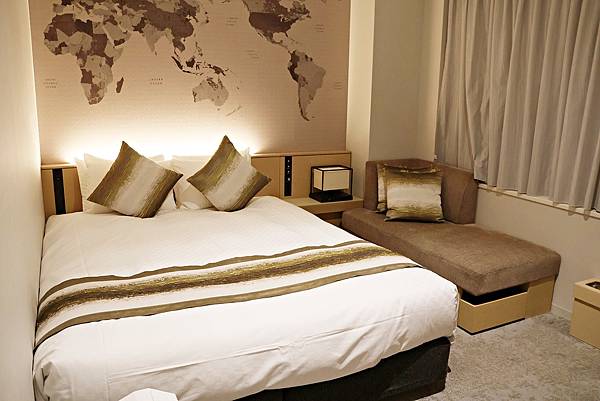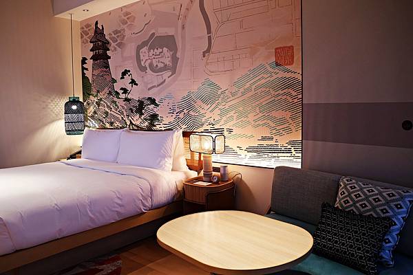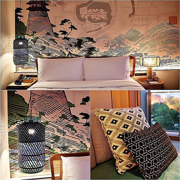 打開房門馬上被房間裡的裝飾深深吸引,處處皆是匠心獨具的設計,每個細節都在訴說著當地歷史與犬山文化。例如:牆壁上的浮世繪描繪了木曾川與犬山城下町的景象,床頭板的形狀猶如鸕鶿捕魚的木船,與壁畫結合起來令人彷彿置身於木曾川上。連靠墊上的俏皮手裡劍圖案,其靈感都是來自根五郎武裝祭司,好細緻的構思啊~~~