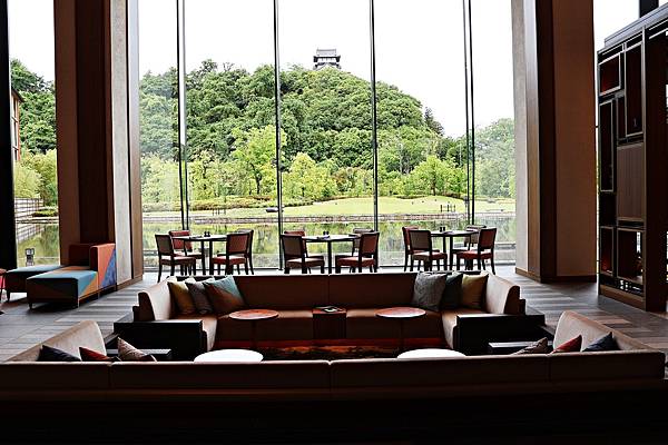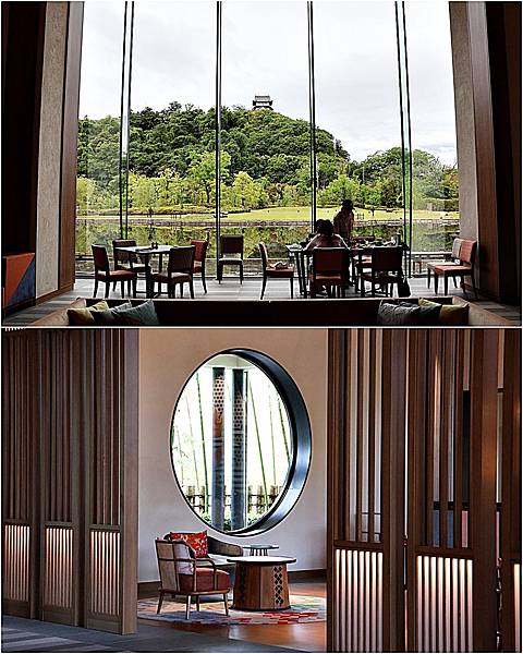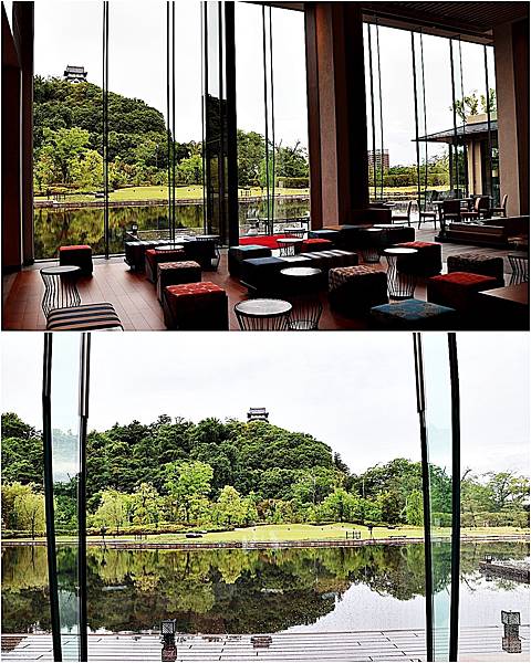第二天早上起床再到大廳裡看到的是另一種不同於昨晚的景致,明亮的光線從寬廣高大的落地窗外灑落進來,也把犬山城及其所在的青翠山景都一併帶入我們的視野中,真美!