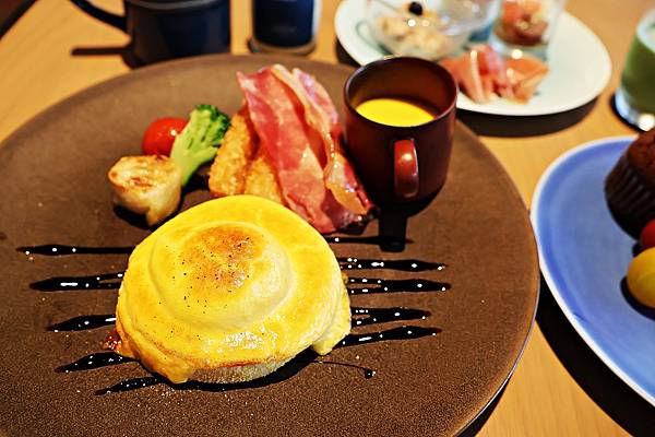 除了自助餐吃到飽外還可以加點一個主餐,照片上這一盤附有南瓜濃湯、香煎培根、炸薯餅、烤蔬菜的班尼迪克蛋就是我點的主菜。在犬山城的陪伴下,這一頓早餐真令人難忘!